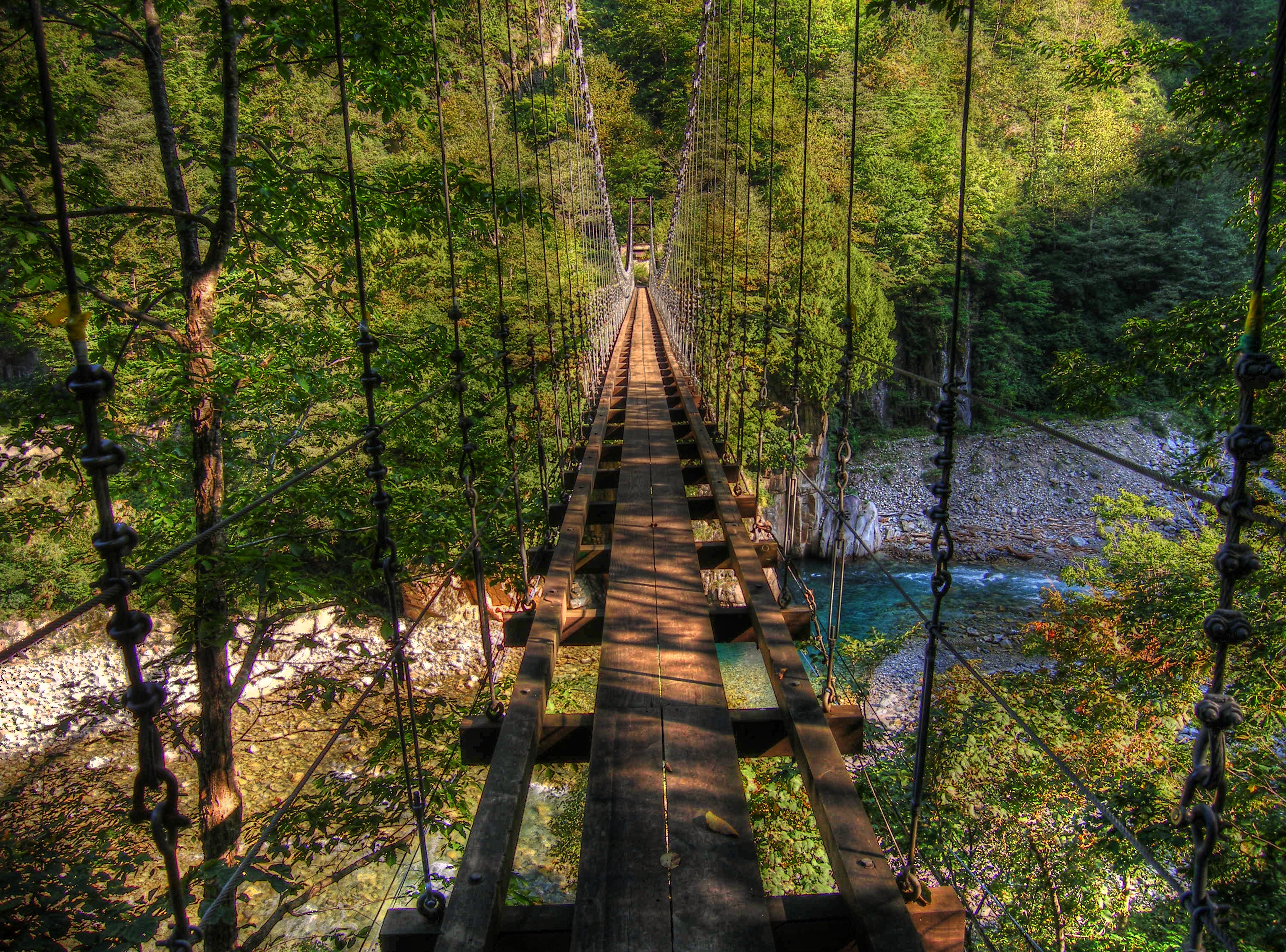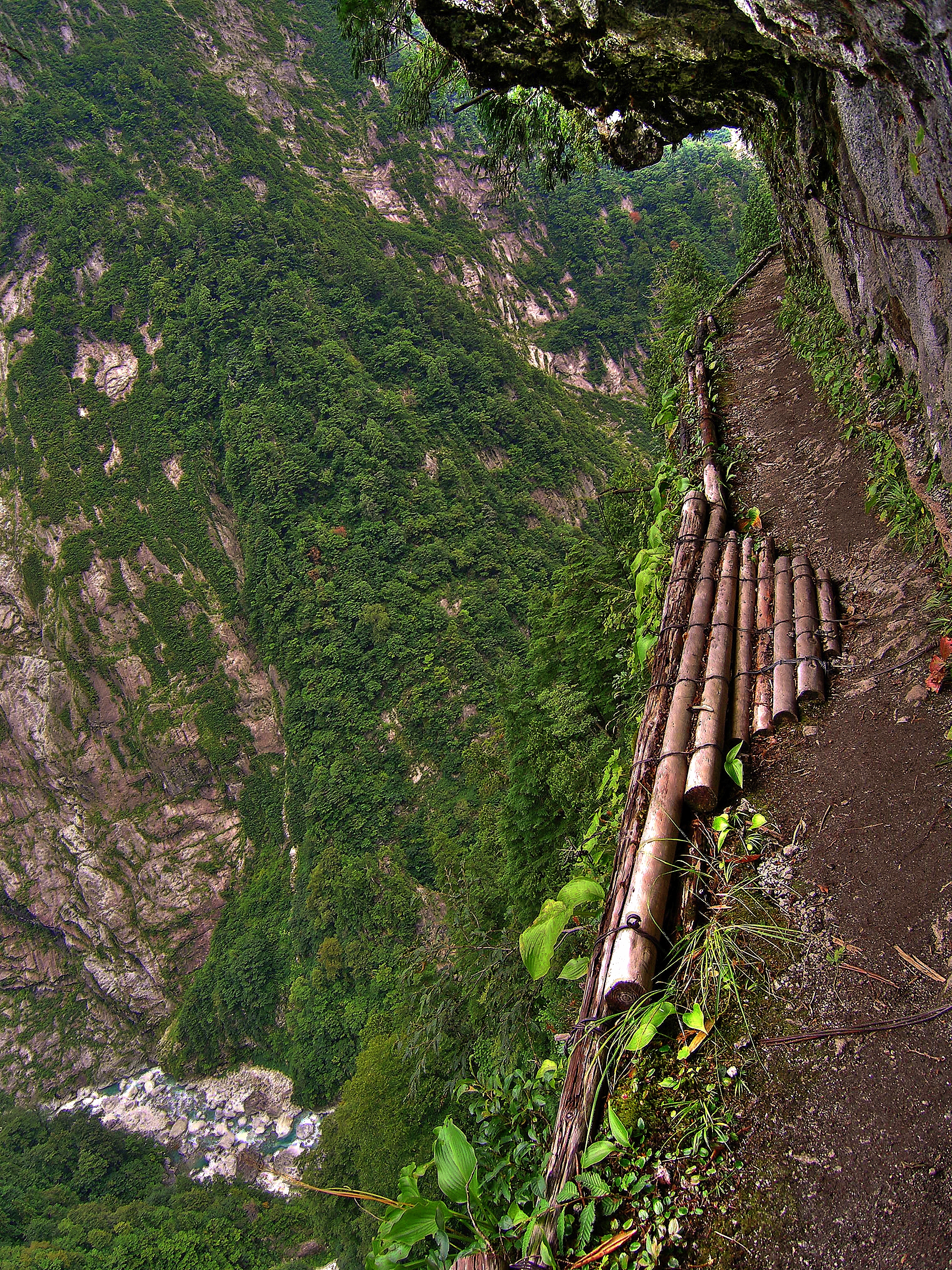 I’d been ogling the Shimo-no-rokka Trail deep in the Kurobe Gorge in the Japanese North Alps for a couple of years. It’s part of a route chiseled out of cliff face back before the Second World War during the rush to harness hydro-electric power. Running southwards, upriver from the end of a rinky dink tourist railway at Keyakidaira, it is initially referred to as the Horizon Trail before becoming the Shimo-no-rokka beyond Asohara Onsen.