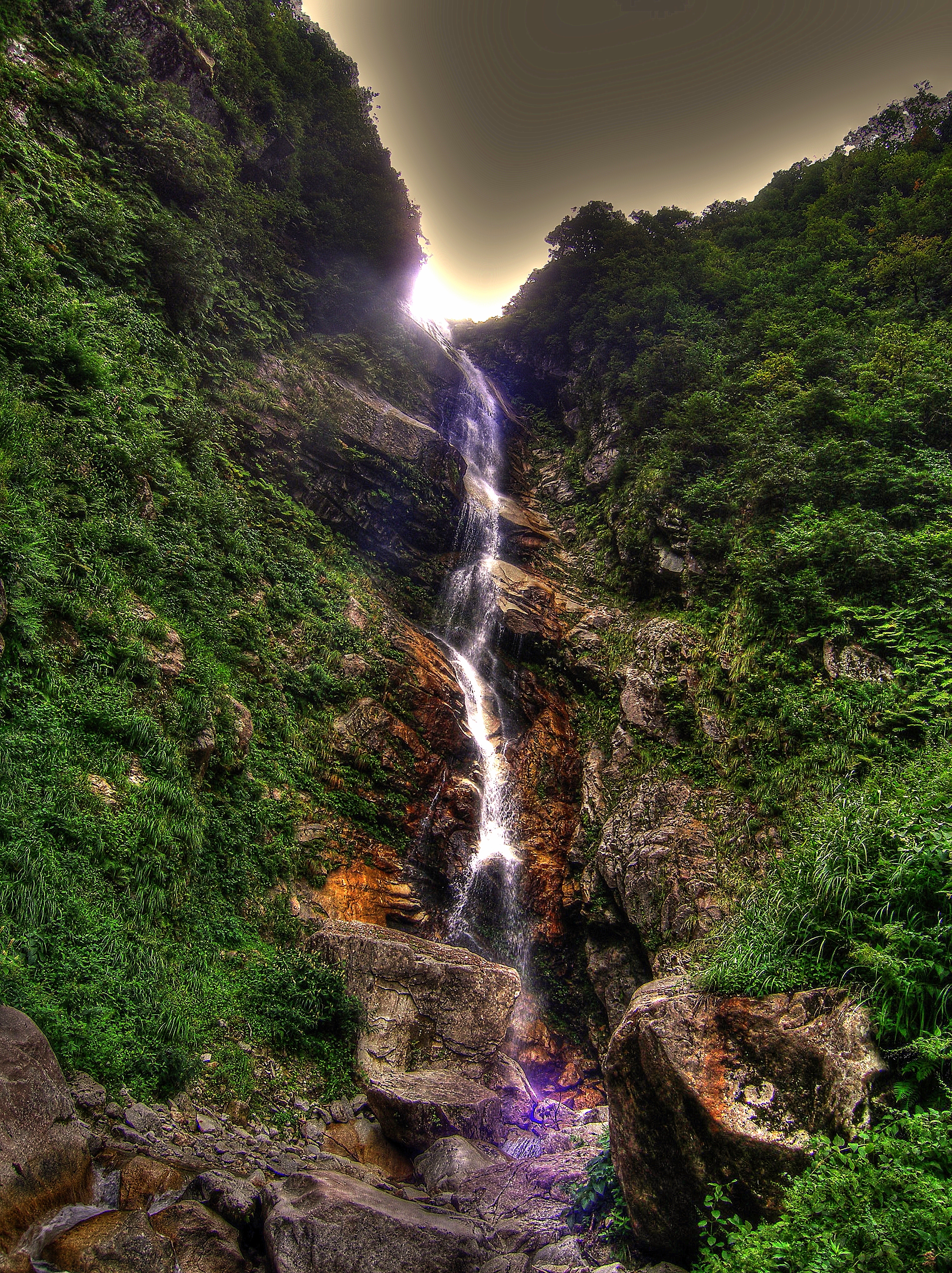 More thrills followed in a leery section of trail cut out of rock face easily some two hundred metres directly above the gorge. From there it wended past a three tiered waterfall and down to the hut and hot spring at Asohara, a spot nestled in a nook where the walls of the gorge reclined slightly from their relentless vertical slant.