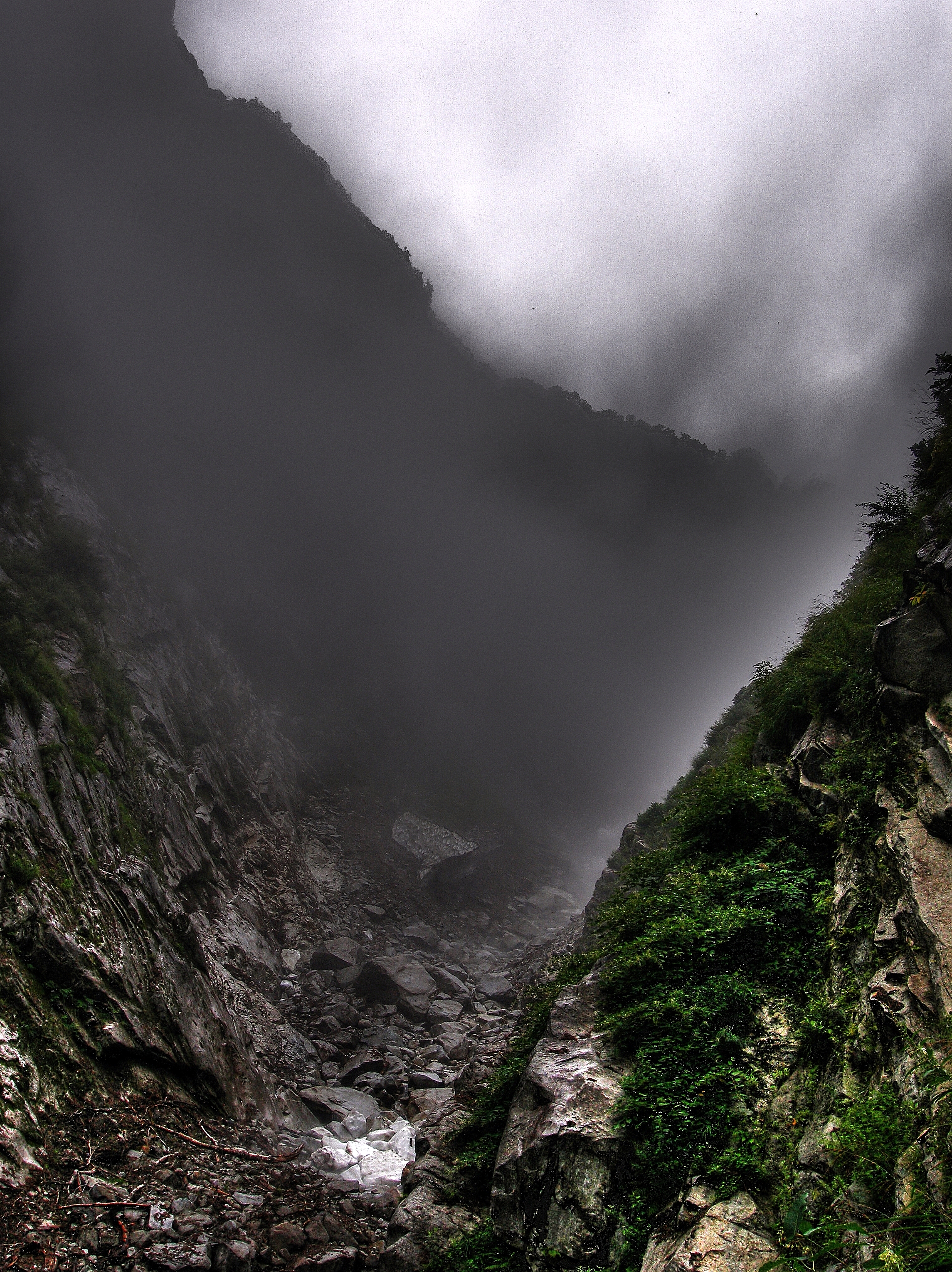 The morning dawned heavy and grey. Cloud clung to the walls of the gorge like the leeches I feared the weather would conjure up. Mountaintops for the most part were lost in the mist.