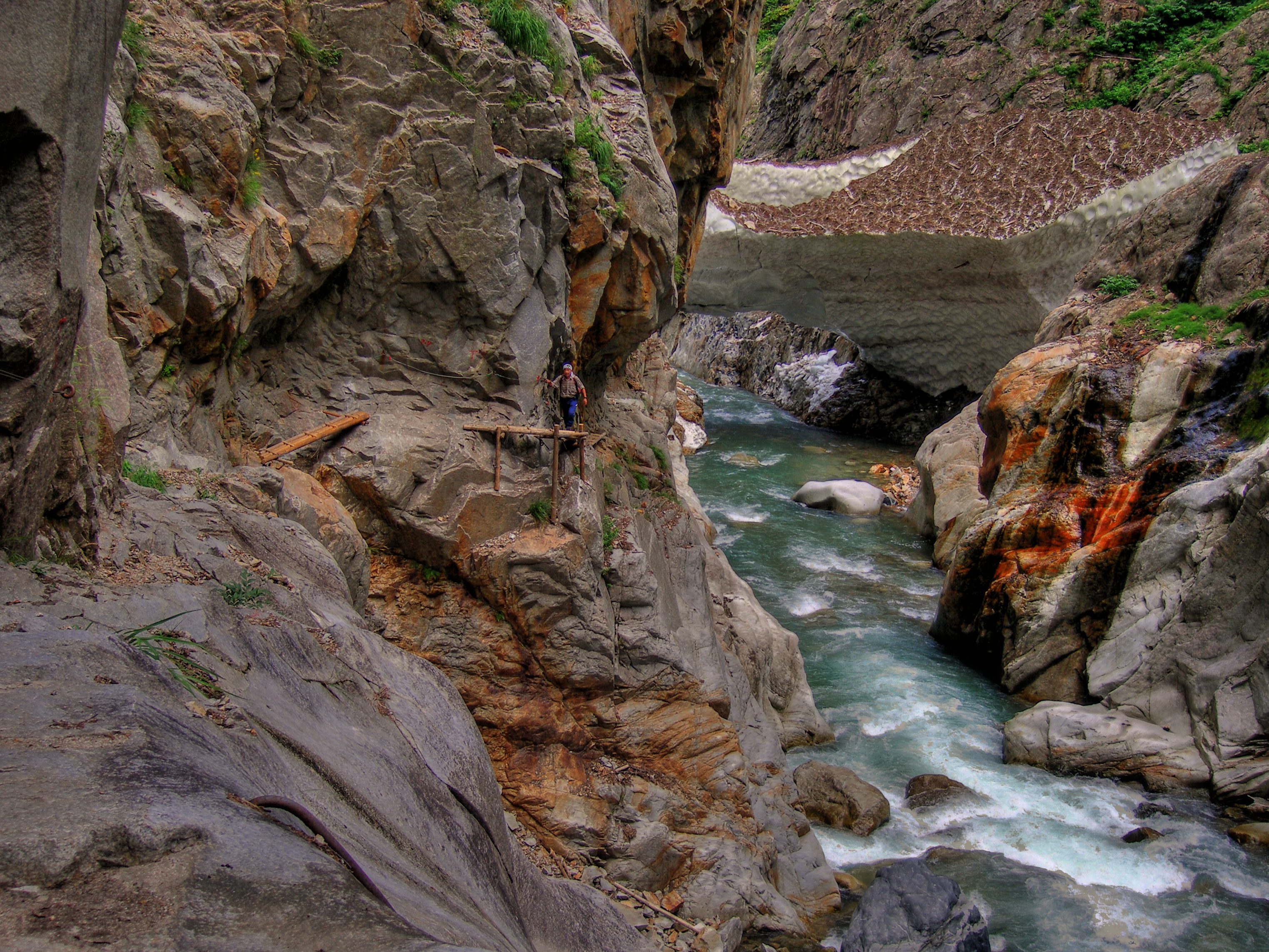 As we descended one of the wooden ladders, literally in the shadow of the bridge, two huge chunks of ice – the size of small cars – parted company with the underside of the arch spanning the gorge, accompanied by a couple of ear splitting cracks, and crashed into the waters below. Riveted to the spot, I wasn’t so sure if the contents of my bowels hadn’t parted company with the lower reaches of my digestive tract to boot.