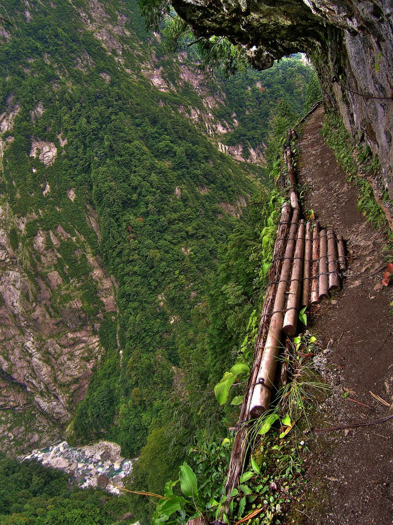 More thrills followed in a leery section of trail cut out of rock face easily some two hundred metres directly above the gorge. From there it wended past a three tiered waterfall and down to the hut and hot spring at Asohara, a spot nestled in a nook where the walls of the gorge reclined slightly from their relentless vertical slant.